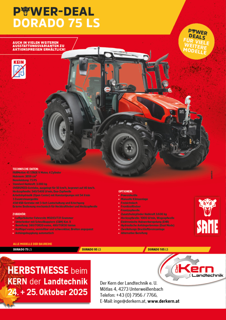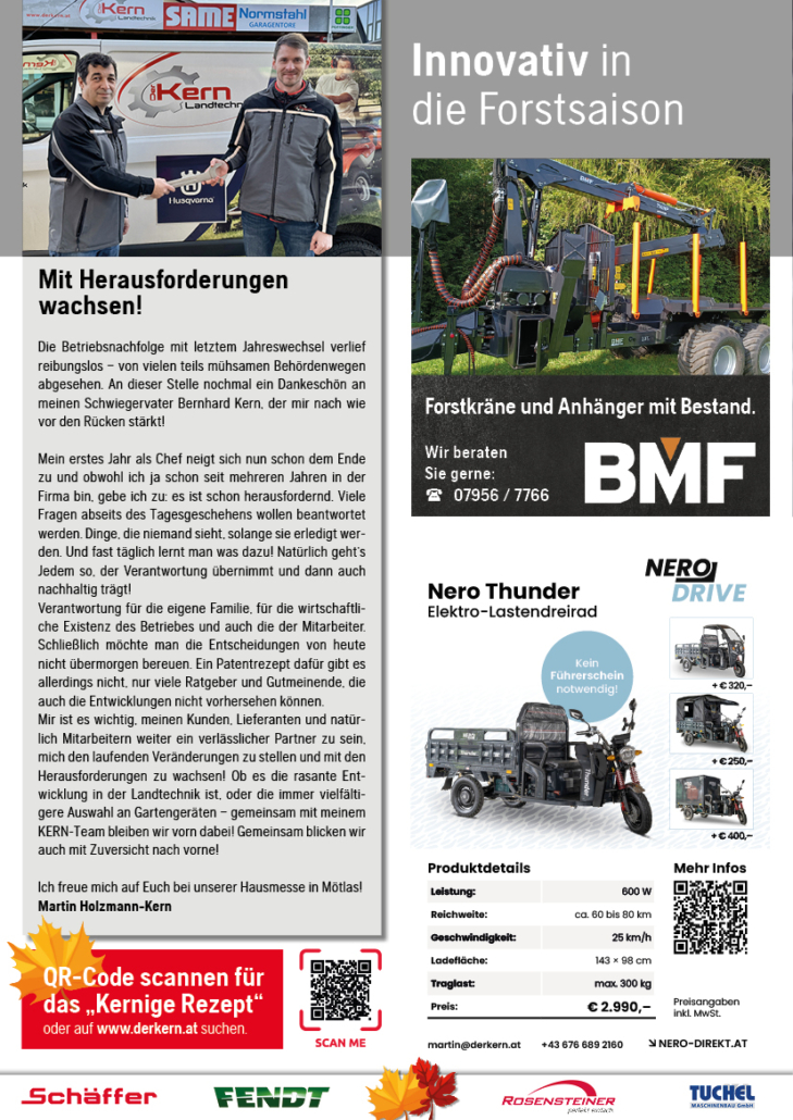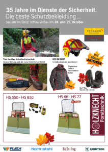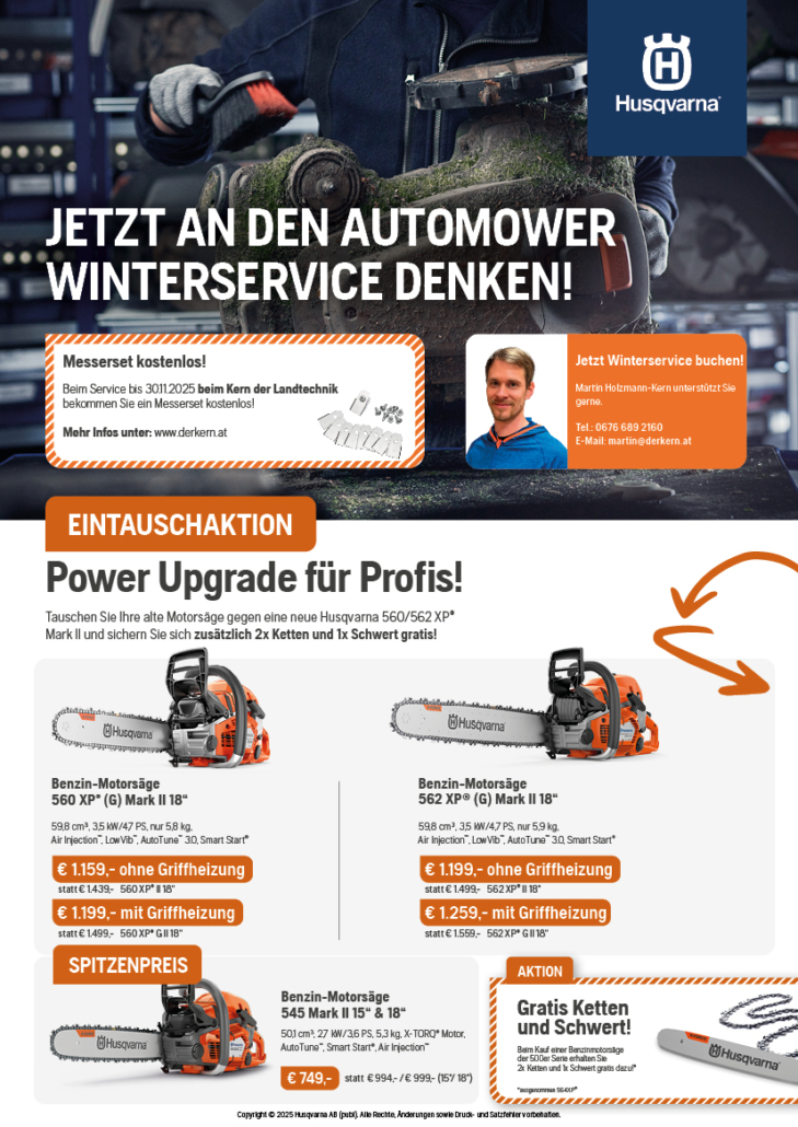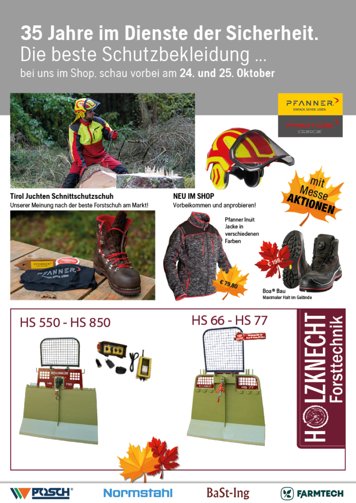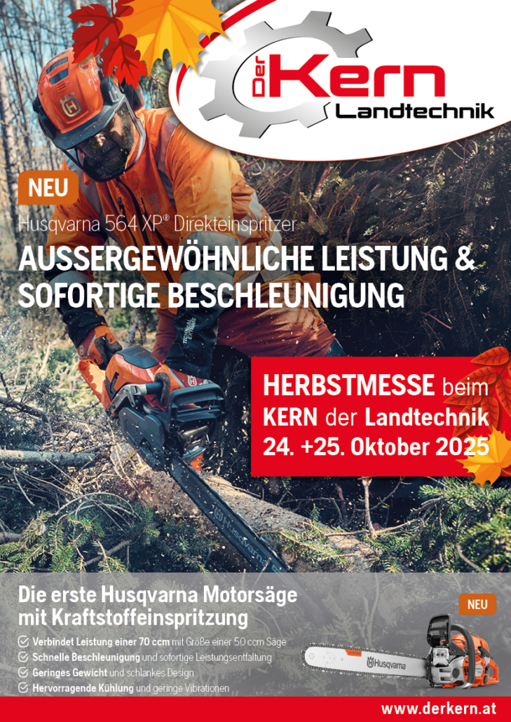 Jede Menge tolle Angebote erwarten die Besucher an beiden Messetagen! Einerseits im Shop, wo zum Beispiel die Forst- und Freizeitbekleidung von Pfanner präsentiert wird und vom Schnittschutzstiefel bis zum PROTOS Kopfschutz auch anprobiert werden kann. Andererseits finden sie am Freigelände verschiedenste Produkte und Innovationen der Hausmarken vom KERN. Testen sie die Spitze der Sägen-Evolution: die NEUE Husqvarna 564XP Motorsäge. Nutzen sie die Gelegenheit, holen sie sich die Informationen aus erster Hand und profitieren sie von den Spitzen-Messe-Preisen! Und noch ein Tipp: bringen sie ihren Automower gleich zum Winter-Service, sie bekommen ein 9teiliges Messerset bis 30. November gratis dazu! Der Chef Martin Holzmann-Kern und sein gesamtes Team freut sich auf Ihren Besuch!
