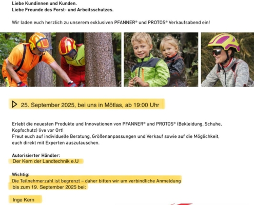 Am 25. September 2025 laden wir ab 19:00 bei uns in Mötlas zum Pfannerabend. Erlebt die neuesten Produkte und Innovationen von Pfanner® und Protos® (Bekleidung, Schuhe, Kopfschutz) live vor Ort.